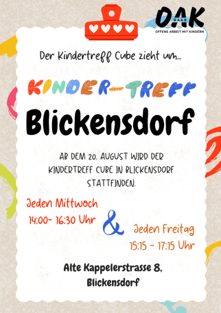 Der Kindertreff Blickensdorf (ehem. im Aktionshaus cube) ist ein offener Begegnungsort, wo du dich mit Freundinnen und Freunden treffen, Spiele spielen oder etwas nach deinen eigenen Vorstellungen organisieren kannst – Wir freuen uns auf deinen Besuch!